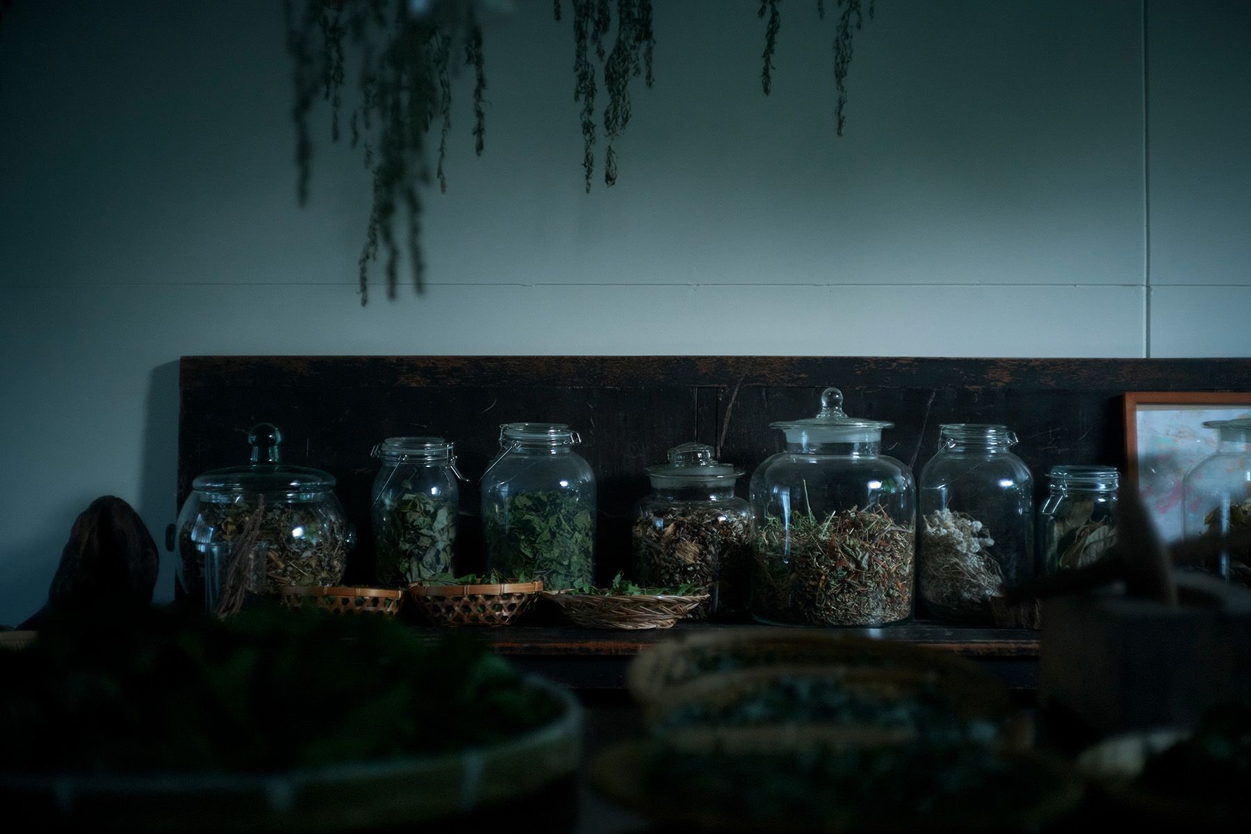 In a certain room at the lodge, the earth's bounty quietly matures—spring buds, summer medicinal herbs, autumn nuts—each harvested in its season, silently aging with time as an ally. Glass jars line the shelves, wild herbs hang from the ceiling. Each time the wind passes through, layers of mountain fragrance rise into the air.